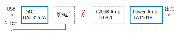 ブロック図です。接続する手持ちのスピーカーが低効率なので、+20dBの増幅器を追加しています。φ3.5のステレオジャックをアンプ入力に使用するか、DAC出力に使用するかを選択できるよう、ジャンパーポストを使用して切り換えられるようにしました。前項の画像の左下です。(赤白のジャンパープラグの部分) |